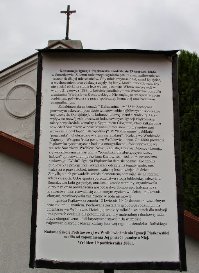 Na grobowcu widnieje tablica pamiątkowa mówiąca: "Gdy śladu po mnie nawet nie zostanie a tylko wicher w posępnej żałobie będzie Ci szeptał pieśni mojej łkanie wspomnij Ty o mnie...” Ignacyja Piątkowska. Tablicę położono 11.VI.1991 r. w dniu nadania Szkole Podstawowej we Wróblewie im. Ignacyji Piątkowskiej".