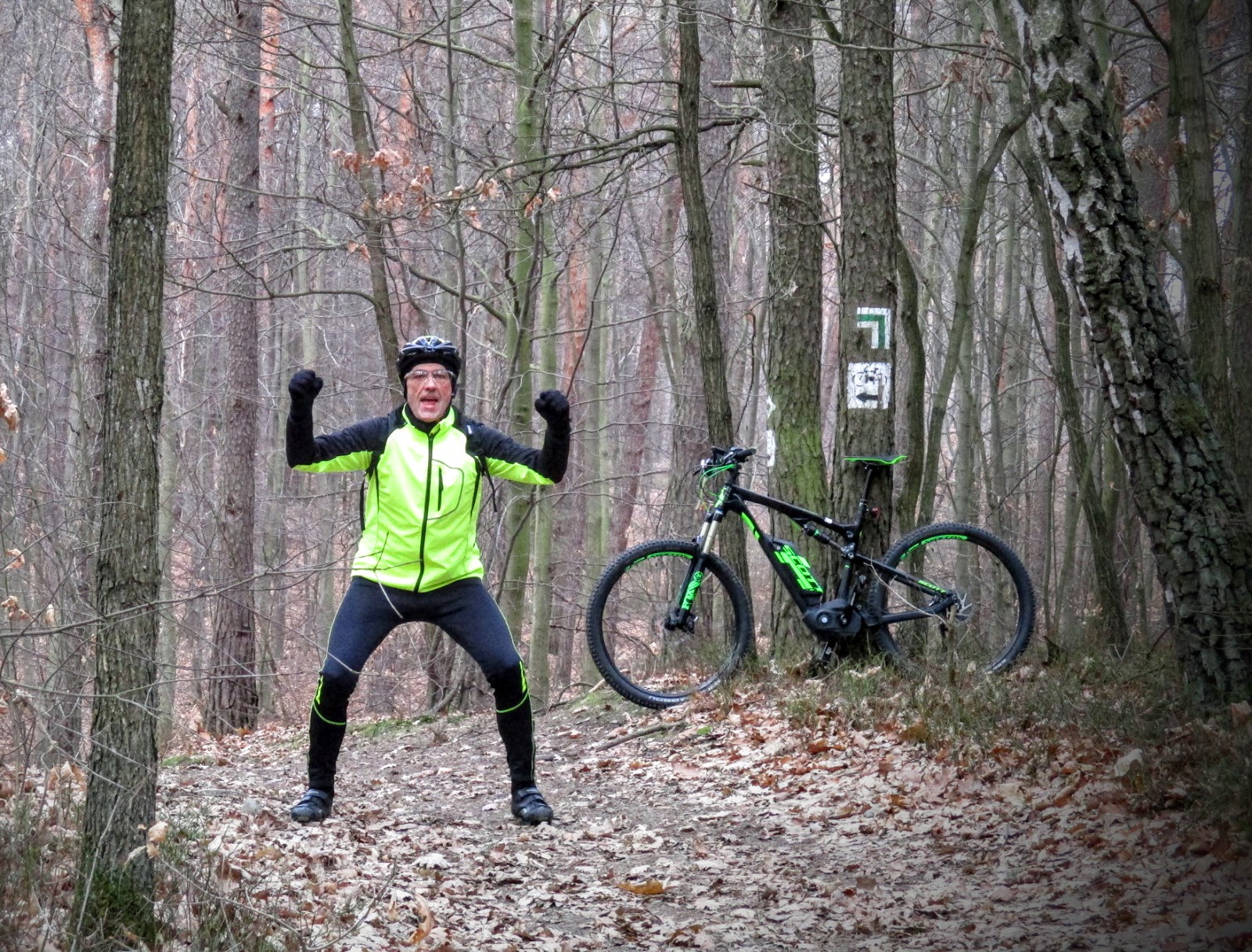 Ścieżka biegnie ostro z górki i po przejechaniu ok. 75 m, należy zmienić kierunek na zachód (co demonstruje Mr E-SCOTT). Jest to mniej więcej 45 kilometr "Czarnego szlaku". Tak mi się spodobało to miejsce, że wykonałem tu kilka przejazdów, wchodząc w zakręt "na pełnym gazie" ! Scott E-Genius 910 poradził sobie w takich warunkach doskonale, idealnie wpasowując się w krzywiznę zakrętu ! Opony Schwalbe trzymały się nawierzchni jak nasmarowane klejem, a ziemia, gałęzie i liście, tylko śmigały w powietrze pod naporem ciężaru maszyny (upss ! rower waży dość sporo, bo 21,3 kg).