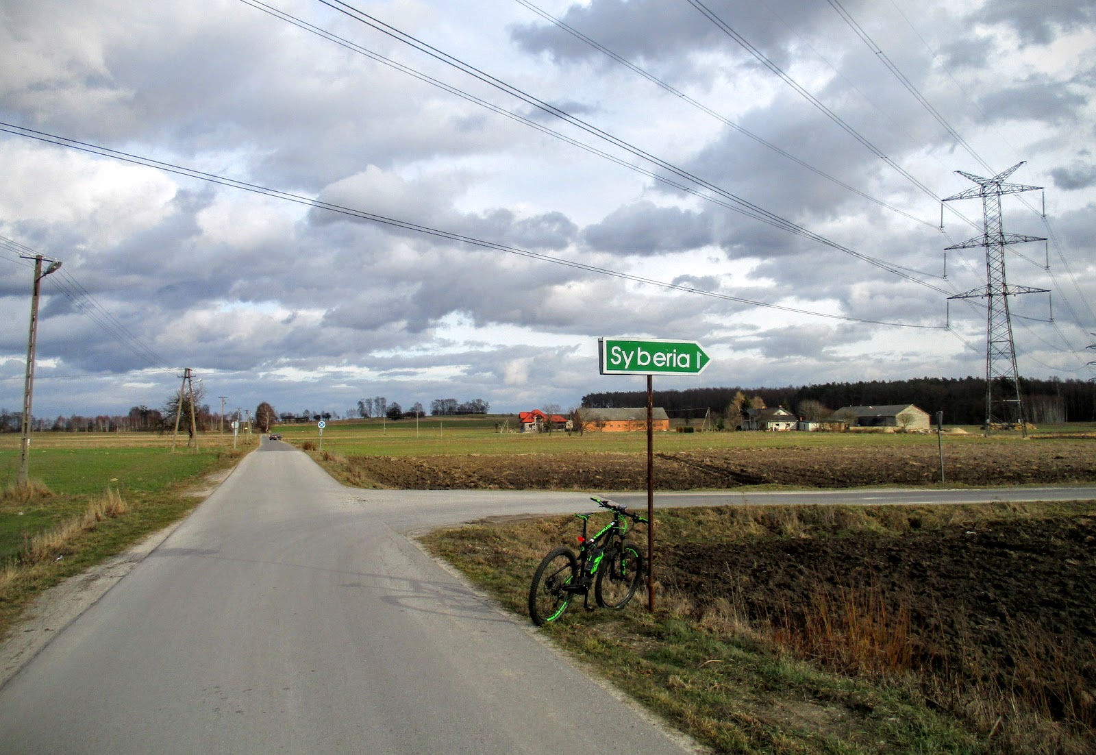 Po pokonaniu 1400 m dojeżdżam do miejsca, gdzie linia wysokiego napięcia przecina drogę. Skręcam w prawo do wsi Syberia.