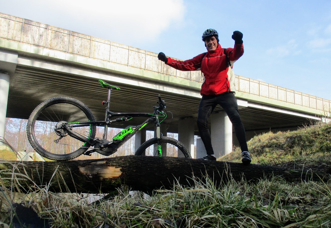 Po dwóch minutach melduję się na wiadukcie nad autostradą A-1. Cieszę się, że Scott E-Genius spisuje się znakomicie, bo już za chwilę czeka mnie ostra, terenowa jazda !