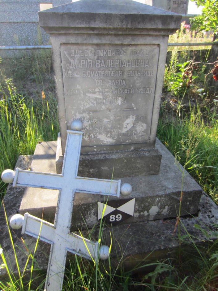 Płyta z wyrzeźbionym motywem roślinnym i napisem w języku rosyjskim : "Lidia Brianskaja córka Gawryły i Ludwiki małżonków Brianskich. Urodzona 31 Maja 1887, umarła 11 grudnia 1892 r. Wieczna jej pamięć".