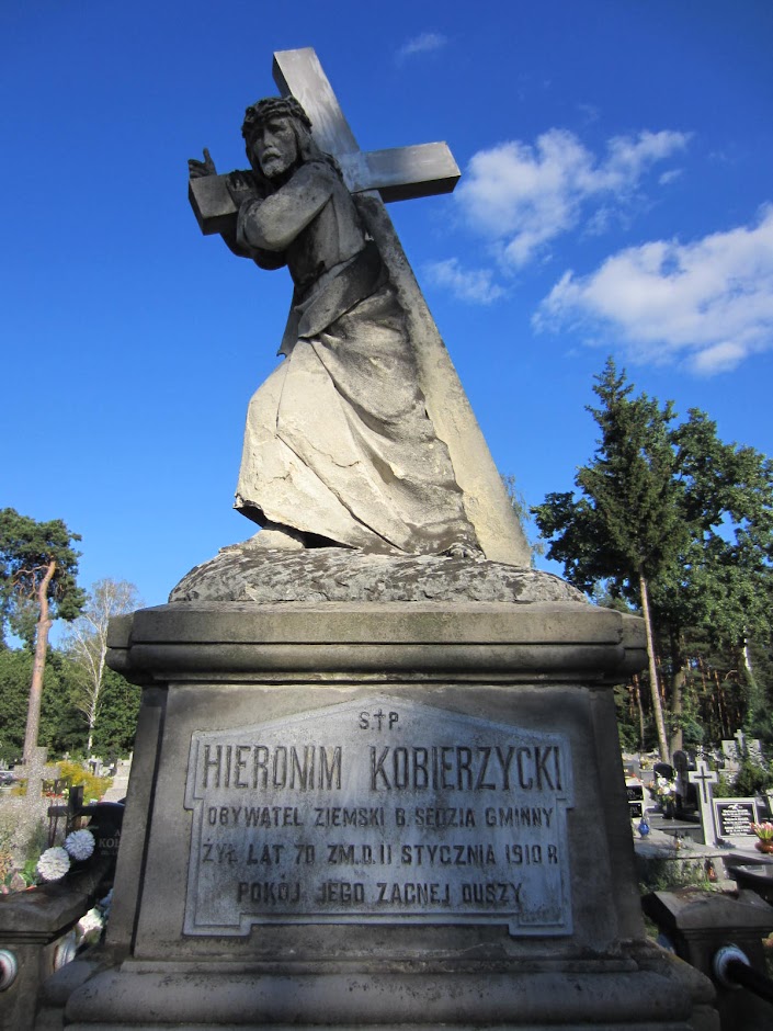 "Ś.P. Hieronim Kobierzycki obywatel ziemski, b. sędzia gminny, żył lat 78, zm. d. 11 stycznia 1910 r. Pokój jego zacnej duszy". Grobowiec zdobi stojąca na wysokim cokole piękna rzeźba wykonana z piaskowca, przedstawiająca Chrystusa niosącego krzyż.
