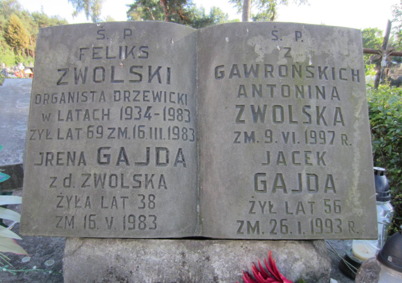 Spoczywa tu m.in. "Ś.P. Feliks Zwolski organista drzewicki w latach 1934-1983, żył lat 69, zm. 16.III.1983".