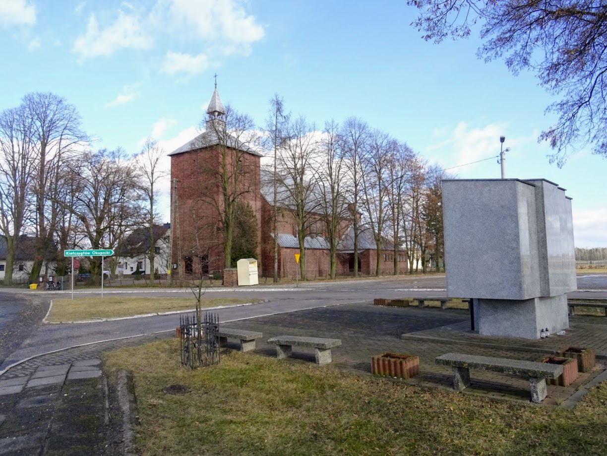 | Centrum miejscowości i rondo przed kościołem, od którego odchodzą ulice Kościuszki, 1 Maja i Ogrodowa. |