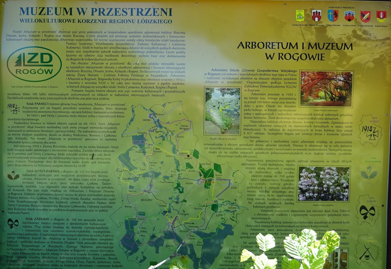 | Rogów znam bardzo dobrze i jestem tu częstym gościem (zobacz np. WYCIECZKĘ Nr 124). Blisko bramy wjazdowej ustawiony jest obelisk z tablicą pamięci oraz tablice edukacyjne. |