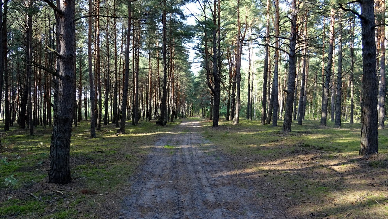 | Asfaltowa droga kończy się i piaszczystą drożyną wjeżdżam w gęsty, sosnowy las. Jest to obszar Sulejowskiego Parku Krajobrazowego. |