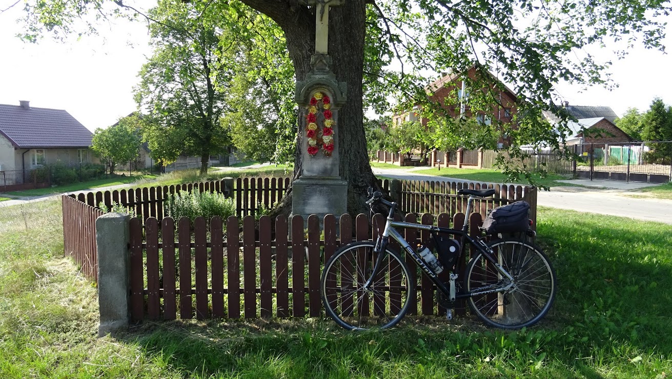 | Jadę znad rzeki do południowej części wsi. Przy drodze ustawiona jest kapliczka z 1902 roku. |
